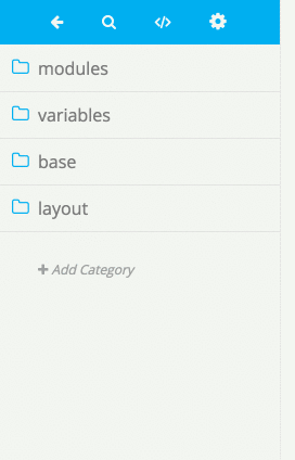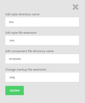 By default Atomic Docs is set up for Scss component style files and PHP markup files. This however can be easily changed even after you have started your project. Clicking on the gear icon in the blue toolbar in the sidebar gives you the ability to change the style partial file extension (to .less for example) as well as the ability to change the markup component file extension (to .twig perhaps).